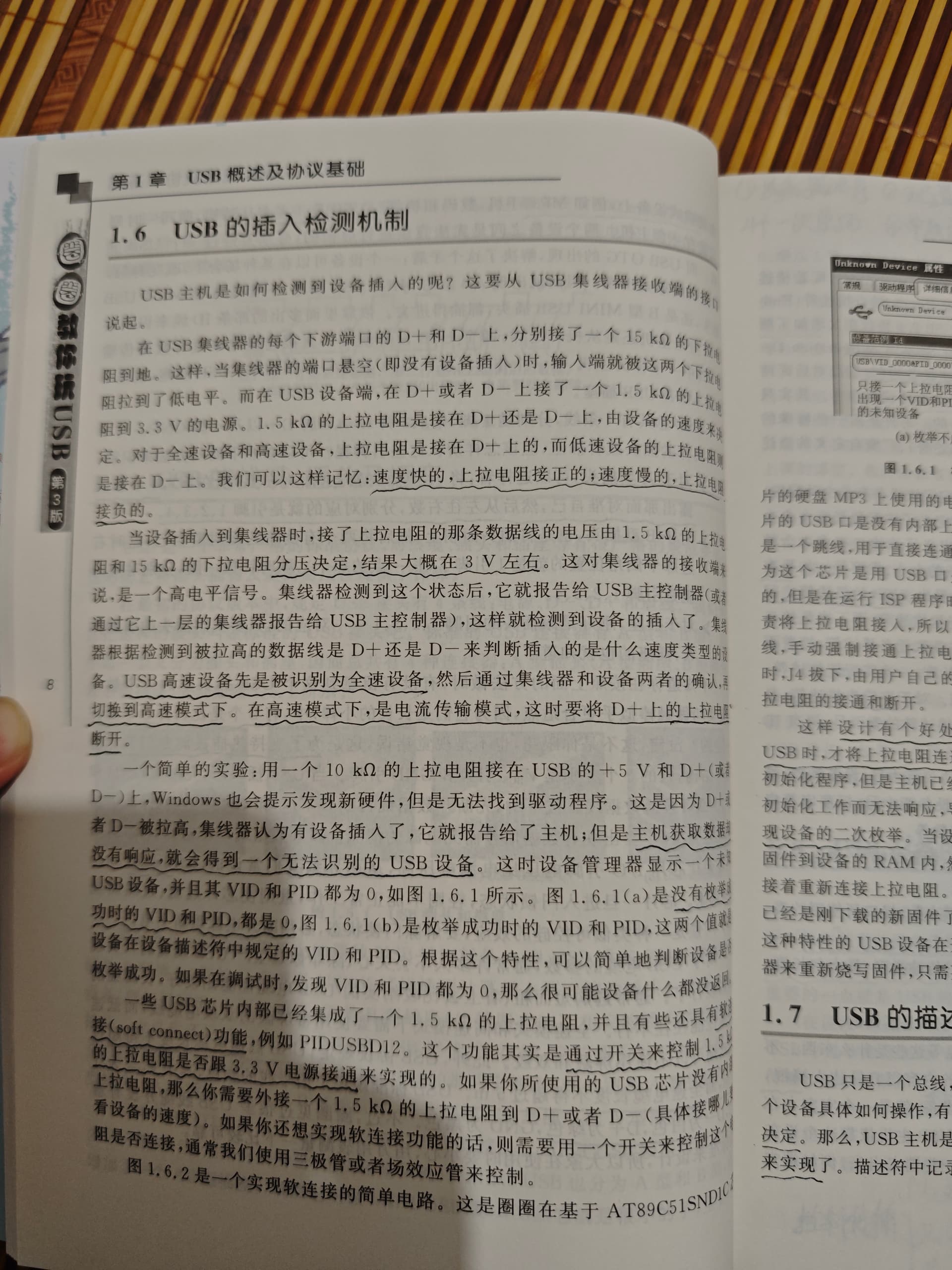 I do follow it, 1.5k pull up to 3.3v means full-speed USB. that’s why the computer is trying to send USB configuration commands, as seen in my dmesg screenshot - it senses this pullup.