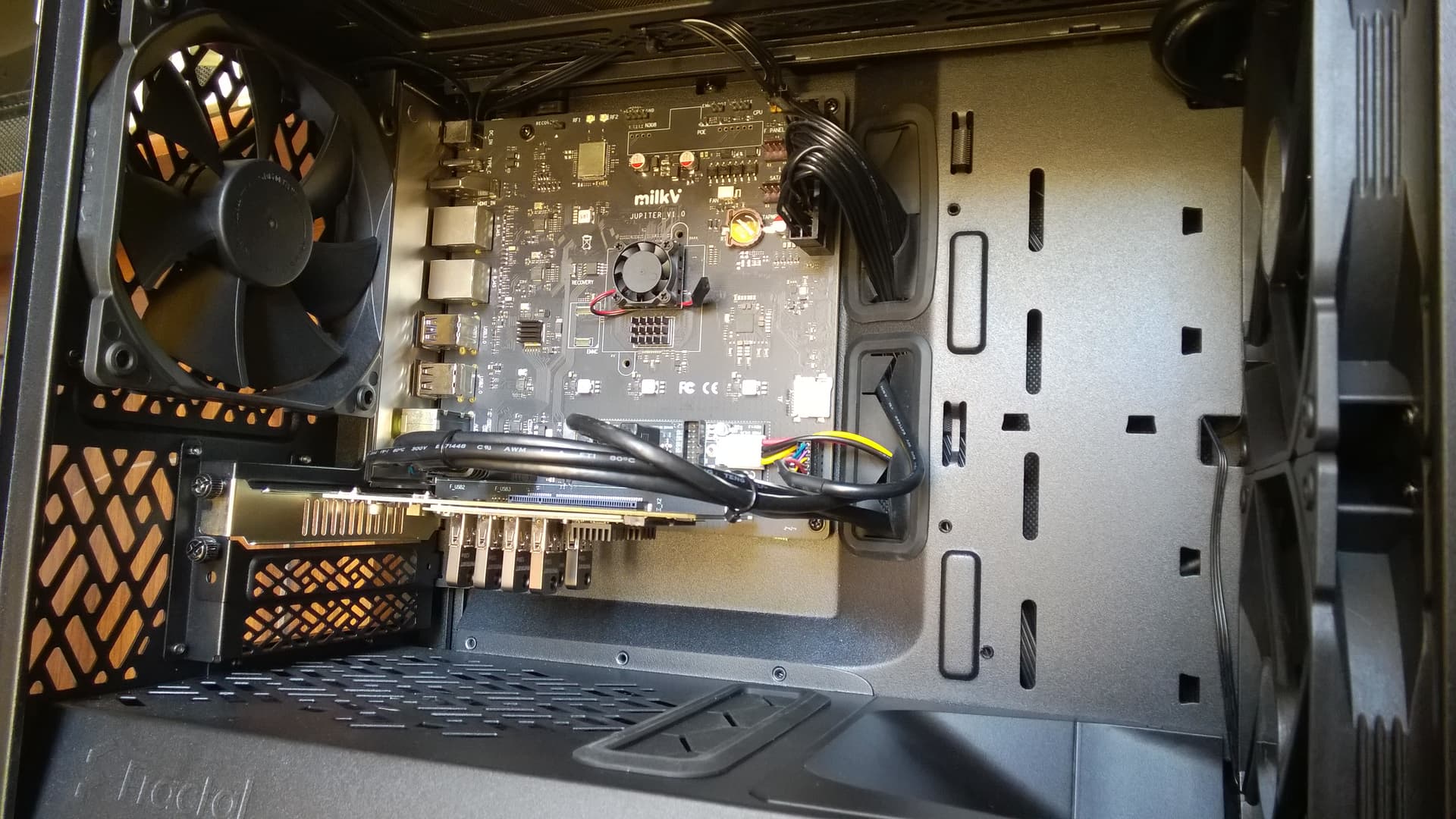 I’m still looking for a large, passively cooled heat sink since my case fans are plugged directly into the power supply thus, my case fans are running full speed at all times because there’s no header to modulate them on the Jupiter, but here’s a photo of my tower as of inserting the M.2 USB-C adapter—I’d like to see Milk-V make a new Jupiter board in the same vain as HiFive Premier P550, but with the scalability of the Jupiter, and correcting some of these minor “inconvenient” issues.